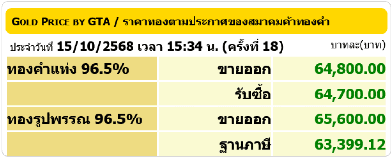 สำหรับราคาทองคำเปิดตลาดประจำวันที่ 15 ตุลาคม 2568 เปิดตลาดปรับขึ้น 300 บาท ในครั้งที่1 ต่อมามีการปรับขึ้น-ลง รวมแล้ว 18 ครั้ง โดยทองรูปพรรณขายออกบาทละ 65,600 ตามข้อมูลจากเว็บไซต์ของ สมาคมค้าทองคำ เมื่อเวลา 15.34 น.