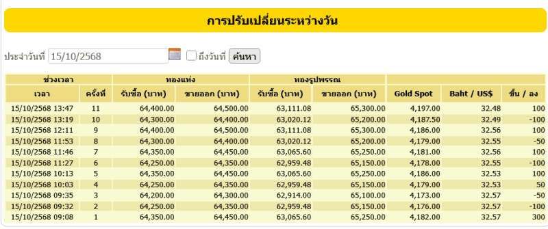 สำหรับราคาทองคำเปิดตลาดประจำวันที่ 15 ตุลาคม 2568 เปิดตลาดปรับขึ้น 300 บาท ในครั้งที่1 ต่อมามีการปรับขึ้น-ลง รวมแล้ว 11 ครั้ง โดยทองรูปพรรณขายออกบาทละ 65,300 ตามข้อมูลจากเว็บไซต์ของ สมาคมค้าทองคำ เมื่อเวลา 13.47 น.